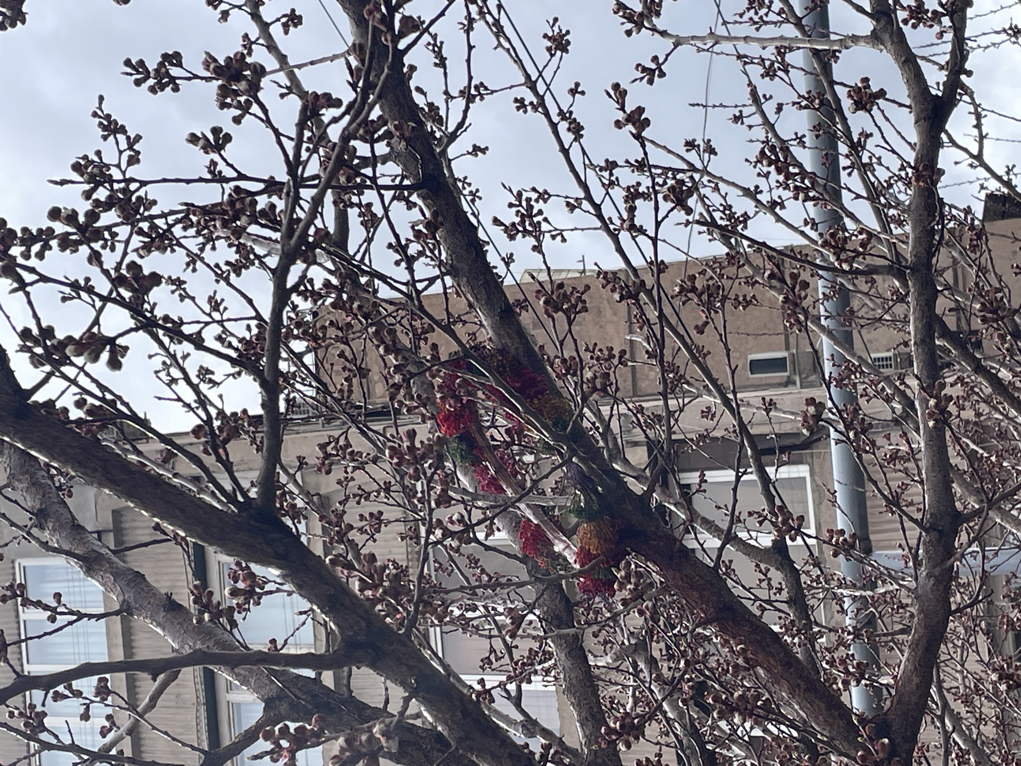 The image depicts a tree with dormant buds in Yerevan, Armenia. A building facade with windows and a grey pipe is visible in the background. A brightly colored object, possibly fabric, is caught in the tree branches. The sky is overcast.