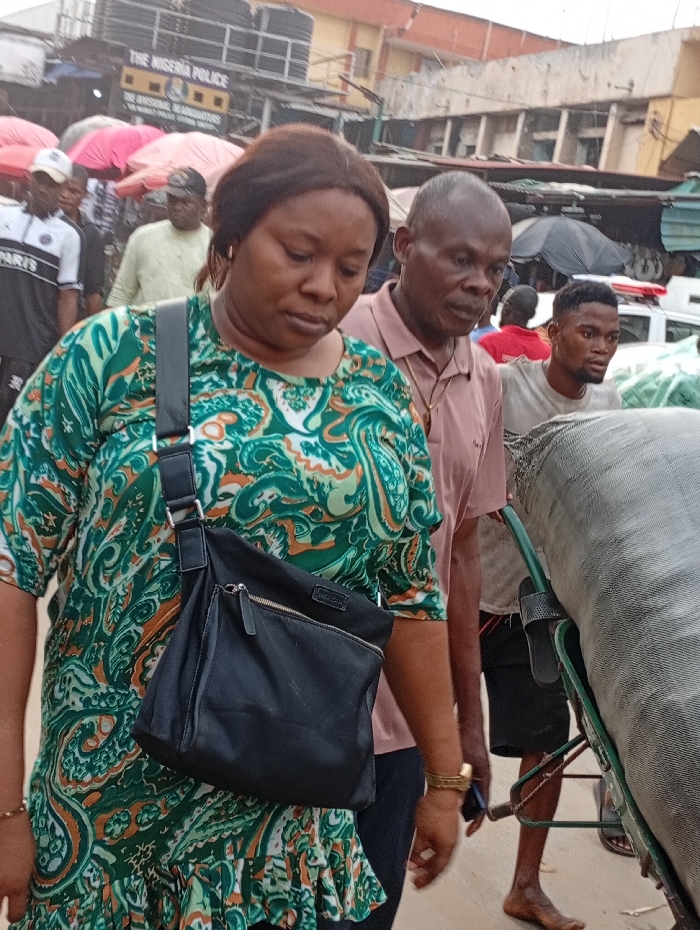 A woman in a green and orange patterned dress and a black crossbody bag is walking alongside a man in a pink shirt. Behind them, a young man is pushing a cart with a large bundled item. They appear to be in a busy outdoor market or street setting, with people and umbrellas visible in the background. A sign for "The Nigeria Police" can be seen in the distance.