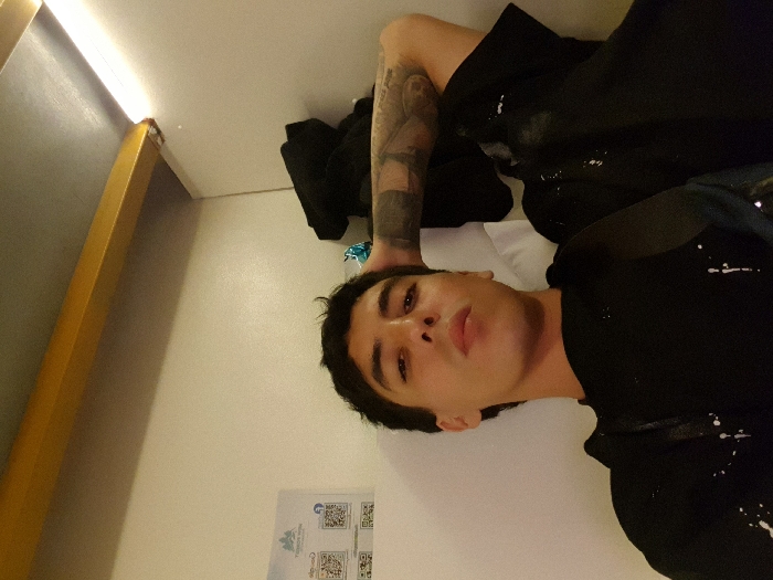A man lies on a white surface, presumably a bed. He wears a black shirt splattered with white paint and has a tattoo on his left arm. A black jacket sits near his head. The background is a plain white wall with a light fixture and a poster featuring QR codes. He faces the camera with a relaxed expression, his head slightly tilted.