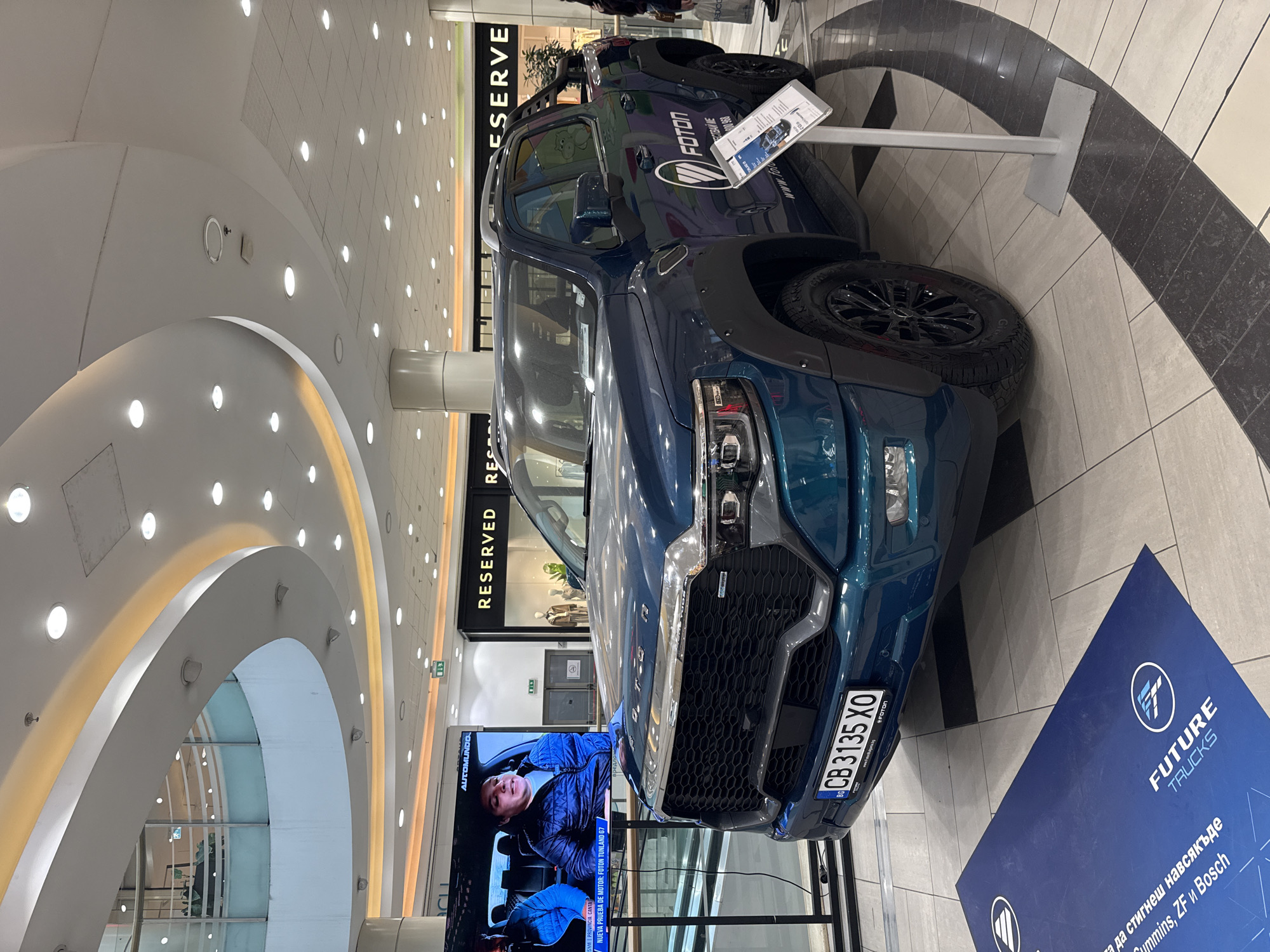 The scene depicts a brightly lit, multi-level indoor shopping mall located in Sofia, Bulgaria. The environment is characterized by a modern architectural design, featuring a cream-colored ceiling with multiple concentric curved bulkheads that are internally illuminated with a warm yellow light, complemented by numerous recessed circular spotlights. A glass balustrade on an upper level provides a view of the lower floor. The floor beneath consists of light gray/beige square tiles interspersed with dark gray/black rectangular tiles arranged in a curvilinear pattern. The central subject is a dark teal Foton Tunland G7 pickup truck, prominently displayed. The truck features chrome "FOTON" lettering on its grille and bears a Bulgarian license plate, "CB 3135 XO," on its front bumper. It is positioned on a large blue floor mat that reads "FUTURE TRUCKS" and includes additional Bulgarian text: "за да стигнеш навсякъде Cummins, ZF и Bosch" (to get everywhere Cummins, ZF and Bosch). A gray vertical display stand stands beside the truck, providing promotional information and a small image of the vehicle. To the left of the truck, a large vertical digital display screen shows a video. The video features a male individual in a blue puffer jacket seated inside a vehicle. The screen displays the "AUTOMUNDO" logo and Spanish text, "NUEVA PRUEBA DE FOTON TUNLAND G7" (New Test of Foton Tunland G7). In the background, behind the truck, a "RESERVED" clothing store is visible, its storefront featuring mannequins dressed in apparel. A single, partially obscured individual is visible on the far right, near the truck's rear, carrying a white shopping bag branded with "Dedeco." No direct interactions with the displayed vehicle or between individuals are discernible. A green emergency exit sign is mounted on the wall above the digital display screen.