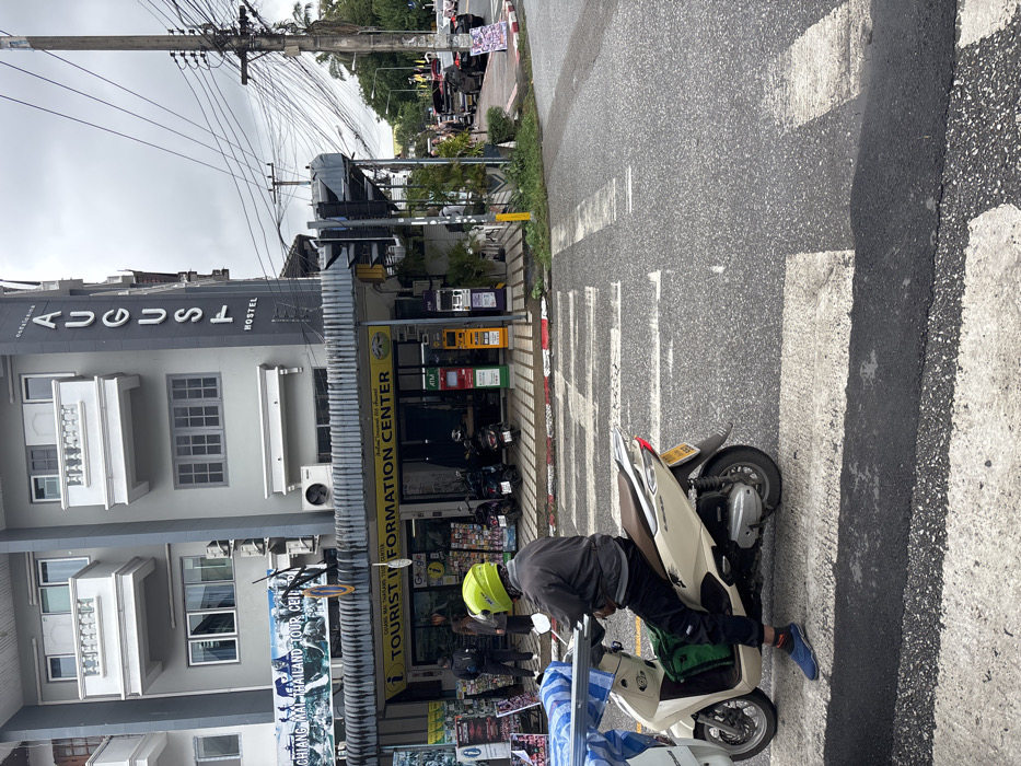 A street scene features the "Augusta" hostel and a "Tourist Information Center," with visible ATMs. A person wearing a yellow helmet is seated on a beige scooter, parked on the edge of the road next to a striped crossing. In the background, a web of overhead wires spans across a partly cloudy sky. A variety of advertisements and signs are displayed along the storefront.