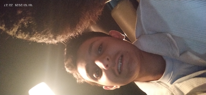 A close-up, rotated photograph depicts a young male positioned from a low angle in a dimly lit, interior environment within the city of Al-Kiswa, Syria. The male subject, exhibiting a light complexion and dark hair, is smiling, revealing visible dental braces on his upper teeth. He is wearing a light-colored, possibly light blue, collared shirt with a textured pattern. His head is tilted to the right relative to the frame. A dark, textured mass, consistent with human hair or animal fur, is visible in the lower right quadrant, partially illuminated. A bright, rectangular light source is present in the upper right, casting significant glare and serving as the primary illumination. The background is dark and indistinct. A timestamp "18/10/2025 22:27" is overlaid in the lower right corner.