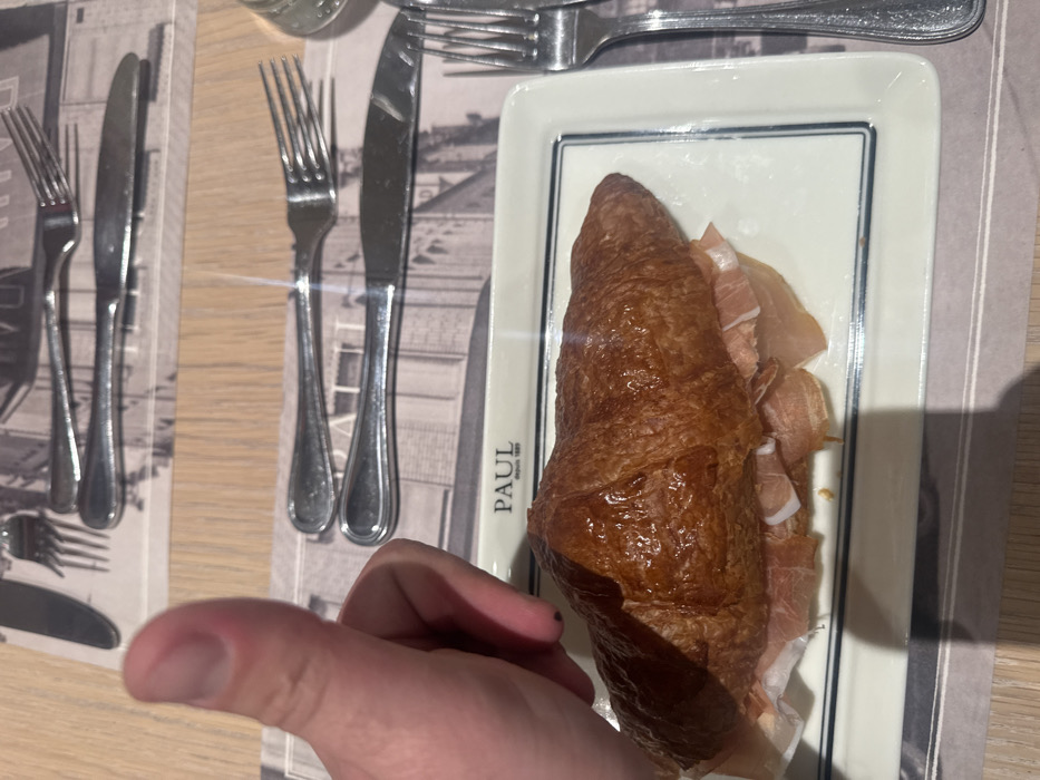 An overhead photograph depicts a table setting at a PAUL bakery-cafe in Yerevan, Armenia. A white rectangular plate, bordered in blue and bearing the "PAUL depuis 1889" logo, occupies the center-right. On the plate rests a golden-brown croissant, sliced horizontally and filled with multiple layers of light pink cured ham. To the upper left, a human left hand is visible, positioned in a "thumbs-up" gesture, with a small dark smudge present on the skin at the base of the thumb. The table surface is a light-colored wood. Three sets of metallic silverware are present on placemats featuring grayscale architectural imagery: one fork and one knife are positioned horizontally above the plate, another fork and knife horizontally below it, and a single fork is placed vertically to the plate's right. A small, round, metallic shaker is partially visible in the upper right corner of the frame.