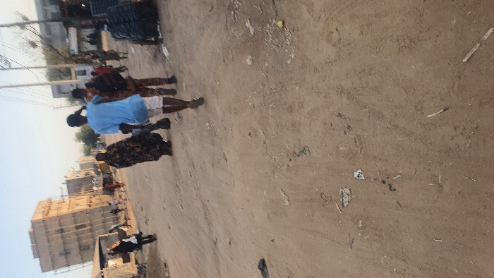 A street scene is captured on a sandy terrain. Buildings and utility poles line the left side, while the ground is strewn with trash. Three figures are visible: one in a blue shirt, another with a floral patterned dress, and a third nearby. More people are seen in the background near the buildings. A stack of square containers sits on the edge of the left side street, adding to the urban environment.