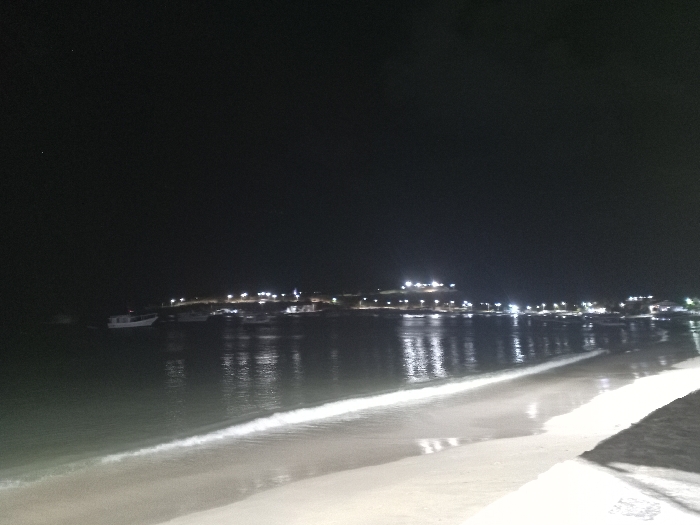 A night scene depicts a beach with gentle waves meeting the shore. In the background, a town or settlement is visible, illuminated by streetlights that reflect in the water, suggesting a harbor or bay. Several boats are docked or anchored off the coastline. The overall ambiance is calm and serene, with the beach appearing deserted except for the soft glow of the shoreline.