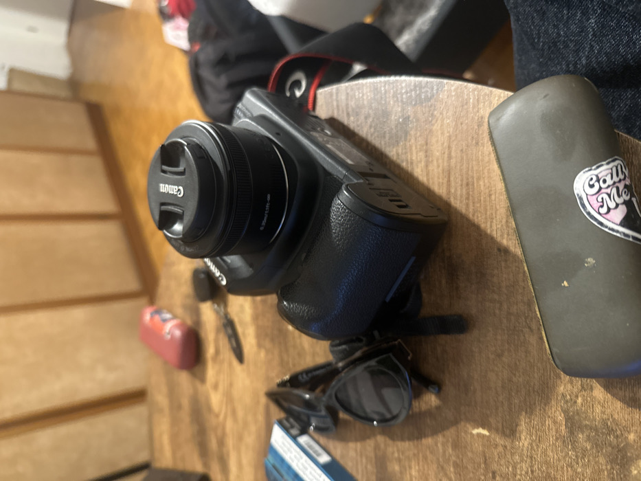 This indoor scene, situated in Treviso, Italy, presents an array of personal effects laid out on a wooden surface. Dominating the central foreground is a black Canon mirrorless camera, fitted with a lens that displays "0.25m/0.8ft-∞" and protected by a black lens cap marked "Canon." A red and black camera strap extends from the right side of the camera body. To the left of the camera, a pair of folded black sunglasses rests near a partially visible blue and white cigarette pack. Further back on the table, a set of keys, including a black key fob, are arranged. Beyond these, a red, oval-shaped case is positioned. In the immediate foreground, at the bottom of the image, lies a dark green glasses case adorned with a partially visible sticker featuring white and pink graphics. The primary surface is a light brown wooden tabletop exhibiting minor wear. The background, out of focus, reveals light brown wooden cabinetry or wall panels and a wooden floor. A human leg, clad in blue denim jeans, is partially visible in the lower right quadrant of the frame, indicating the presence of an individual.