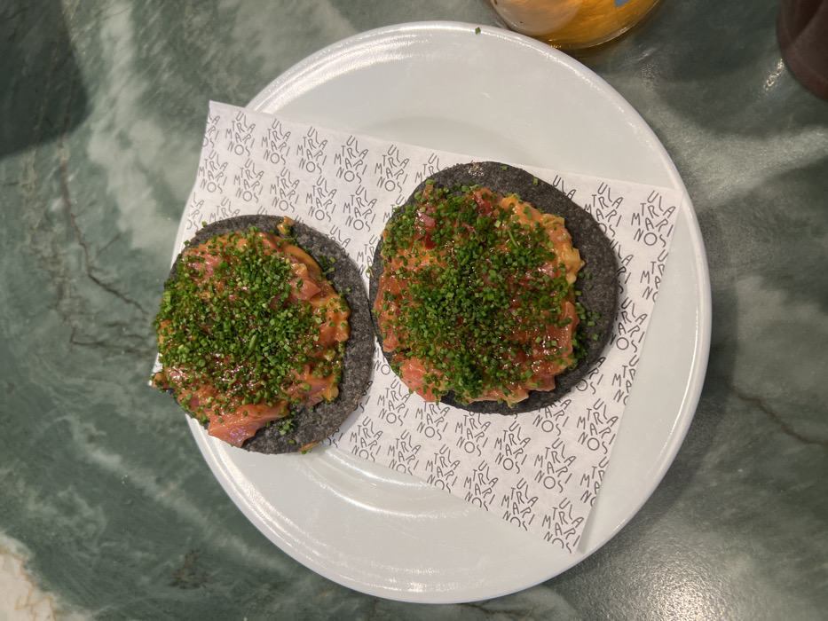 - "Two black tostadas rest on a white plate lined with patterned paper" by FM-fGII93, licensed under CC BY 4.0
