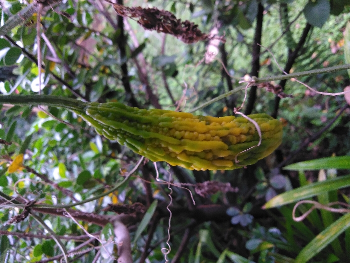 - "The image displays a single, elongated bitter melon fruit (Momordica charantia) hanging vertically from its vine in Chhatre Deurali, Nepal" by FM-ZO9In1, licensed under CC BY 4.0
