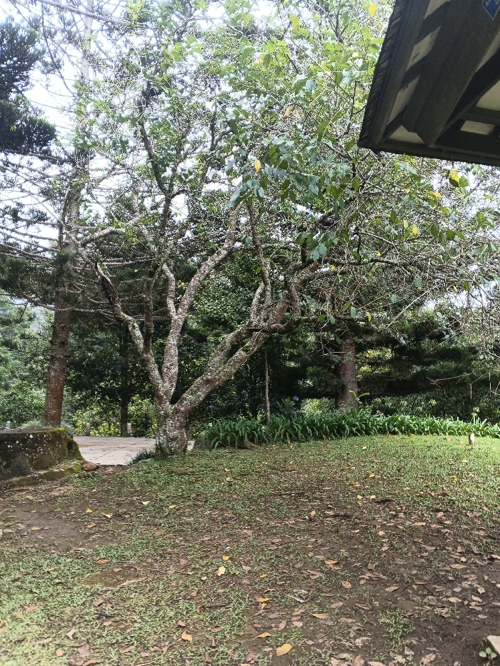 The image displays an outdoor, vegetated environment within Munyati, Zimbabwe, under an overcast sky. The foreground consists of patchy green grass and exposed soil, strewn with scattered brown and yellow deciduous leaves. A low, moss-covered concrete wall is situated on the left. Centrally, a large deciduous tree with multiple gnarled trunks and light-colored bark stands, its branches partially covered in green leaves while others appear bare. Behind this tree, a paved or concrete pathway is visible. Further left in the midground, a tall, slender coniferous tree is present. To the right of the central tree, a neatly maintained strip of dark green, broad-leafed plants forms a border. The background is composed of dense green trees and foliage. In the upper right portion of the frame, the underside of a dark wooden roof eave, featuring white paneling and a visible blue label, extends into the scene. No individuals or animate subjects are depicted.