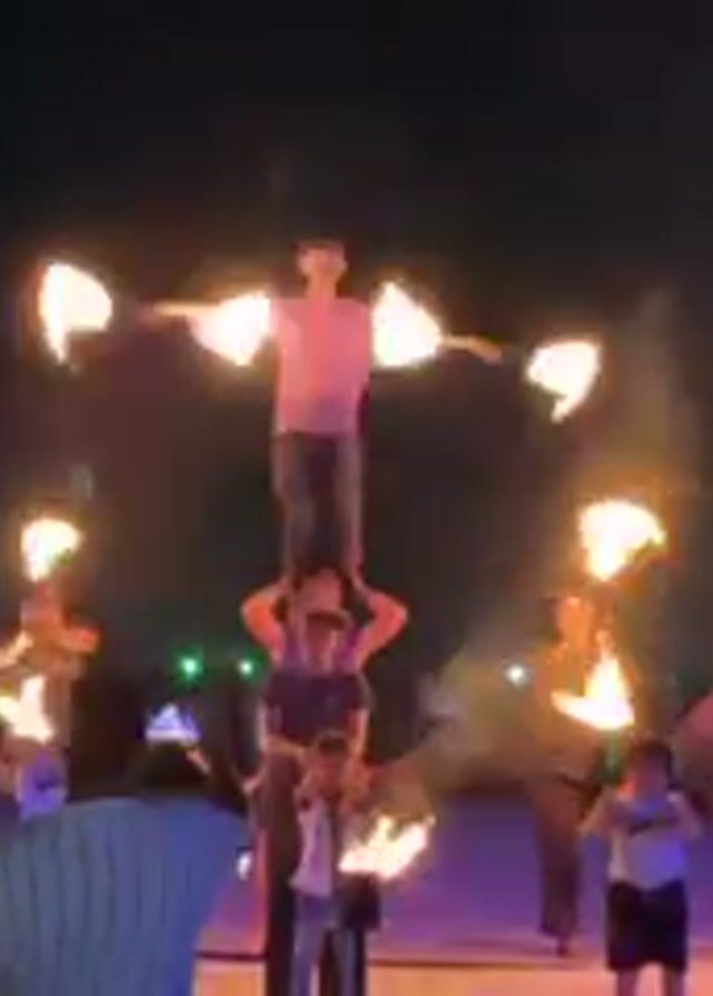 A night time outdoor scene shows a group of people performing a fire show on a stage, with an audience watching. There are about seven performers, all wearing casual clothing, who are spinning flaming torches. One performer is standing on top of another, creating a two-person human pyramid. The top performer has his arms outstretched while juggling torches. The scene is lit by the flames and spotlights. The background is dark, with some lights visible in the distance. Some audience members are taking pictures with their phones.