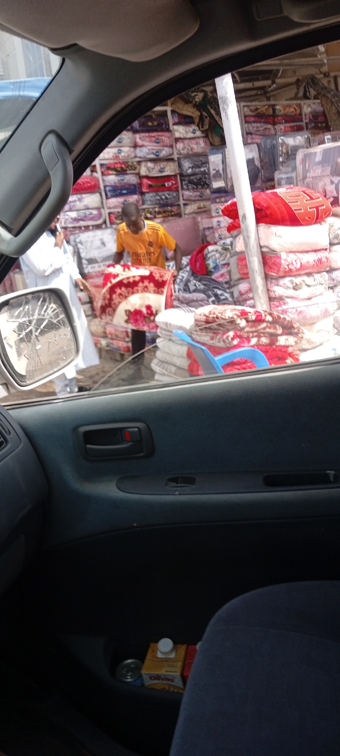 The image depicts an outdoor market scene in Kofar Ruwa, Nigeria, viewed from the interior of a vehicle. The foreground shows the car's dark blue/grey dashboard, door panel with a black handle featuring a red lock indicator, and a storage compartment holding a yellow "CHIVITA" juice carton and a silver can. A dark blue/grey car seat is visible in the lower right. A severely cracked side mirror reflects a distorted portion of the scene. Outside the vehicle, the primary subjects are two males and numerous textile goods. A dark-skinned male in a yellow short-sleeved shirt, bearing "Emirates Fly Better" text, is positioned in the midground, bent forward, handling a red and cream patterned blanket with floral designs. To his left, another dark-skinned male, partially obscured, wears a long white robe and has his right arm raised, appearing to be speaking or gesturing. The background and midground are dominated by stacks of folded blankets or duvets, many encased in clear plastic packaging, displaying various patterns and colors. These goods are arranged on shelves against a wall and in large piles on what appear to be display tables or the ground. A prominent stack of red blankets with a white pattern is visible to the right. A white vertical pole, likely a structural element, stands near the center-right. The scene indicates a commercial setting, possibly a textile or bedding stall.