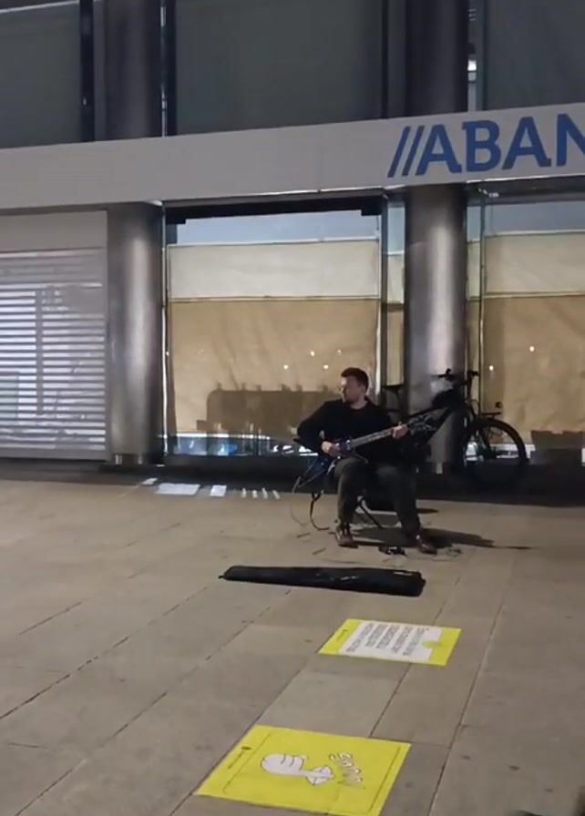 A man plays a blue electric guitar while seated on a metal folding chair in front of a building. A bicycle is parked to his right, and a black guitar case lies open in front of him. Yellow squares with illustrations mark the ground. Another person walks briefly in front of the camera. The building behind the man has a sign that reads "//ABA" and a closed storefront. The ground is tiled.