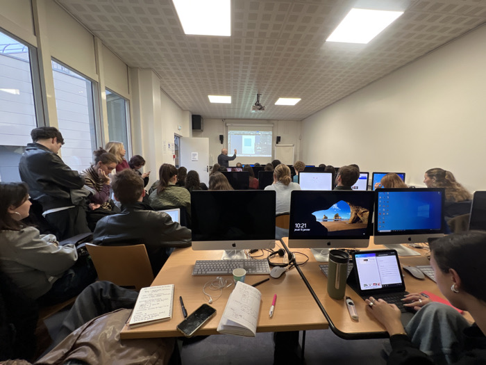The image captures an interior view of a computer lab or classroom, likely located in Neuilly-sur-Seine, France