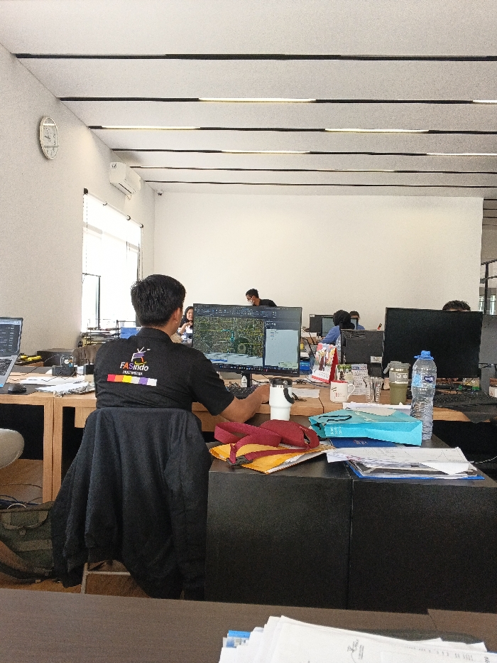 In a brightly lit office, a man in a black polo shirt with "FASindo" printed on the back sits at a computer. He's surrounded by desks cluttered with monitors, papers, and various office supplies. Several other individuals are visible in the background, also working at their desks. The room is modern, with white walls, a clock, an air conditioner, and linear lighting fixtures on the ceiling.