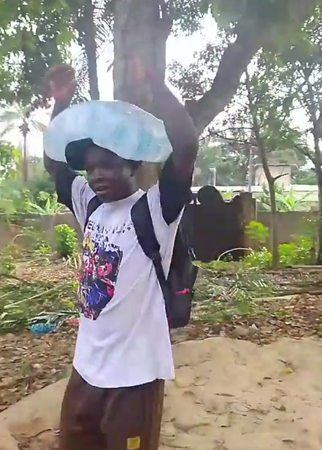A person wearing a white t-shirt with a print, black pants, and a black backpack is walking on a sandy path with trees and foliage on either side. They are wearing a light blue plastic bag on their head. Another person is seen walking in the background. The person in the foreground turns to their right as they walk. A building is visible in the background. The scene is in daylight.