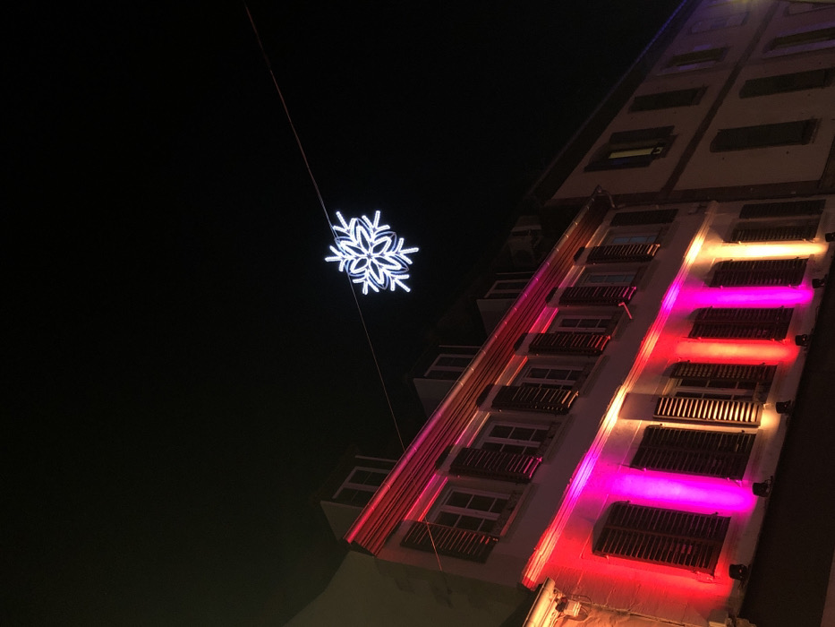 A low-angle shot reveals a brightly lit building with several floors, each featuring shuttered windows. The building's facade is illuminated with alternating bands of red, pink, and yellow light. To the left, a brightly lit, white snowflake decoration hangs suspended against a dark night sky. Thin cables stretch from the snowflake towards the building and upwards, adding to the festive nighttime scene.