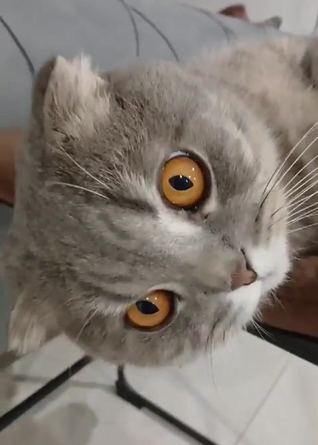 A close-up shot shows a gray Scottish Fold cat lying on a surface, possibly a chair, and looking into the camera with wide, amber-colored eyes