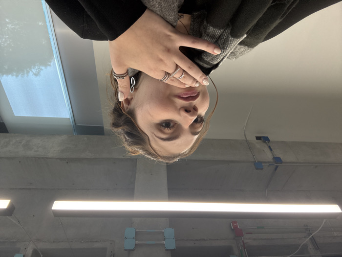 An upside-down photo features a woman with brown hair and brown eyes looking at the camera. She is wearing several rings and a scarf. Above her is a window with a glimpse of the sky. The background includes a concrete ceiling with industrial lighting fixtures, wires, and blue electrical components. The image is slightly blurry.