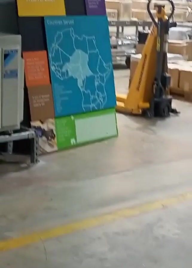 n interior view of a warehouse or factory floor. The floor is concrete with yellow safety lines. Several yellow manual pallet jacks are scattered throughout the space, some empty and others loaded with pallets of cardboard boxes. There are also shelves filled with various items and a few metal carts. In the foreground, there is a standing sign with sections of different colors (yellow, purple, orange, brown, blue, and green). The blue section features a map of Africa. A Daikin air conditioning unit sits next to the sign. The overall lighting is bright, and the warehouse appears to be well-organized. There are no people visible in the shot.