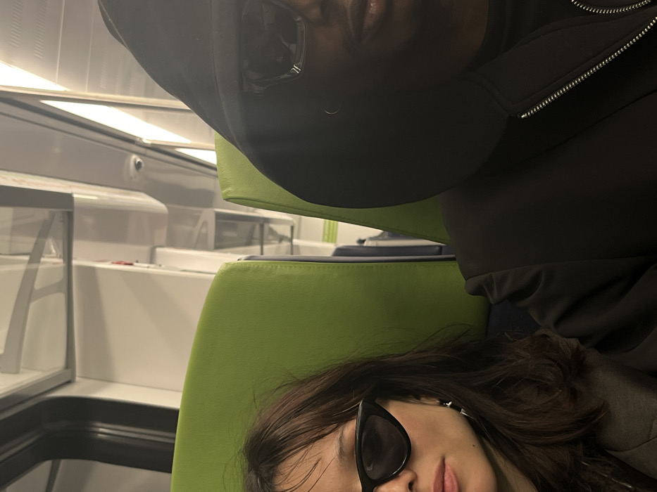 Two individuals are visible in this upside-down angled shot. A person wears a black cap and sunglasses, their upper body dominates the top half. The second person is positioned in the lower half, also sporting sunglasses. Both appear to be sitting on lime green seats inside of a vehicle, possibly a train or airplane due to the compartments and window visible in the background. The lighting seems natural.