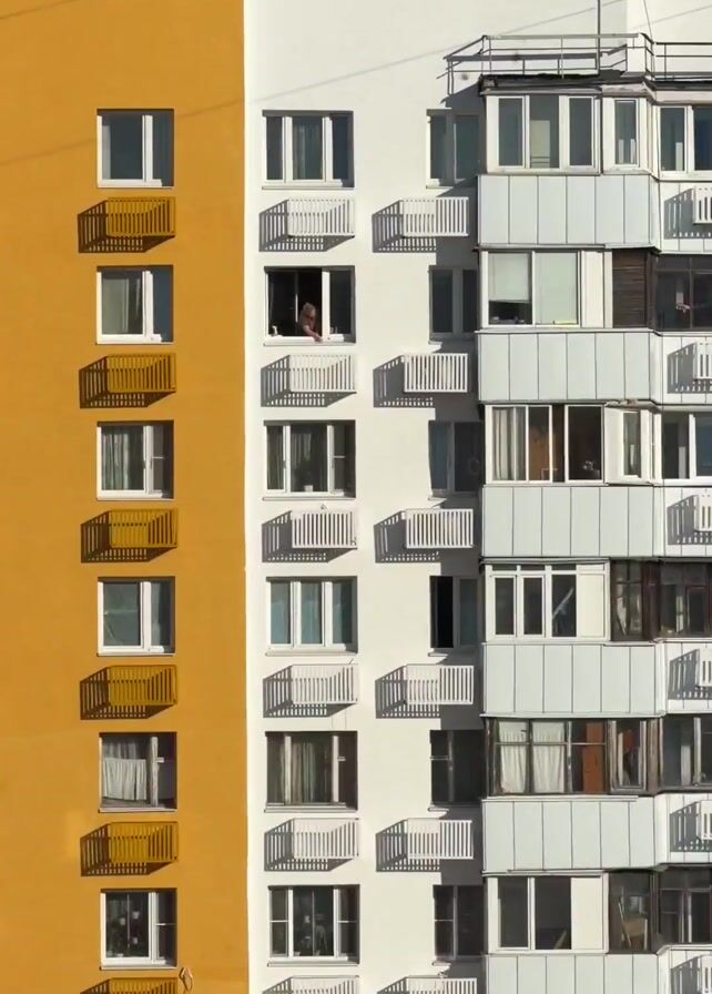 A person stands in the open window of a high-rise apartment building and appears to be cleaning. The building has a white facade with vertical yellow stripes. Other similar buildings can be seen in the background under a clear blue sky. In the foreground, bare trees and parked cars are visible. The view is observed from another building or balcony, part of which is visible on the left side of the frame.