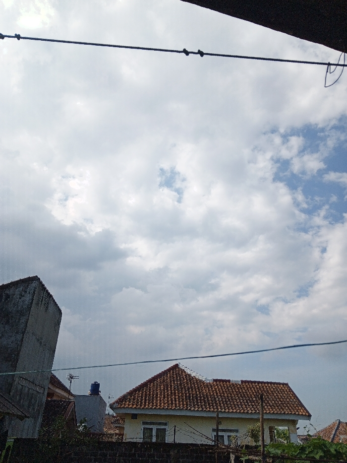 The image captures an exterior urban landscape in Weintiapa, Liberia, under a partially cloudy sky. The upper two-thirds of the frame are occupied by a sky largely covered with white and grey cumulus clouds, with discernible patches of clear blue sky in the upper right and near the center. A taut, dark wire or cable with multiple small, dark cylindrical insulators stretches horizontally across the upper part of the sky. An indistinct, dark structural element is visible in the extreme top right corner. Below the sky, a residential area is depicted, viewed from an elevated perspective. On the left, a weathered, tall, grey concrete structure, possibly a wall or building corner, is partially visible. In the center-right, a single-story house is prominent, featuring a distinctive gabled roof covered with reddish-brown, segmented terracotta tiles. The visible portion of this house's facade is light yellow or beige, with at least two white-framed windows below the roofline. A dark, low wall or fence, topped with what appears to be a security measure like barbed wire or spikes, runs horizontally in front of the main house. Behind and to the left of this house, another building with a flat, grey roof supports a blue cylindrical water tank and a small antenna structure. A partial view of another red-tiled roof is visible to the far right. Minimal green foliage is present in the lower right foreground. No individuals, animals, or active movements are observed within the scene.
