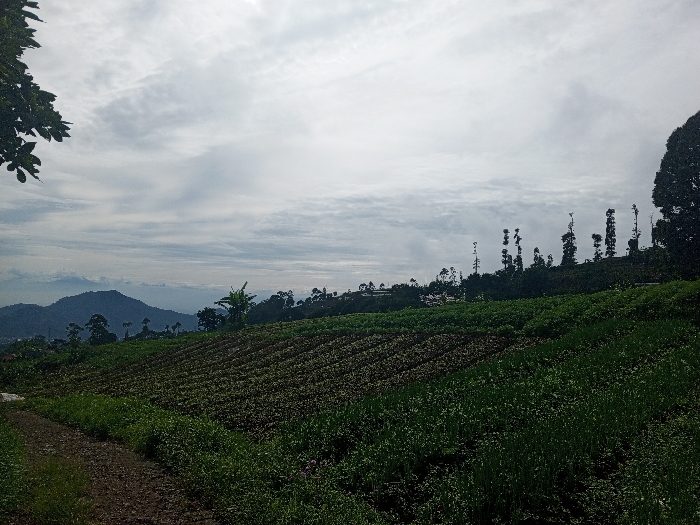A scenic view encompasses a hillside farm under a cloudy sky. Furrows line the cultivated land, contrasting with the lush green foreground. A mountain range rises faintly in the distance, partially obscured by the atmospheric haze. Scattered trees and vegetation dot the landscape, adding depth and texture to the scene. A dirt path edges along the field, inviting exploration.