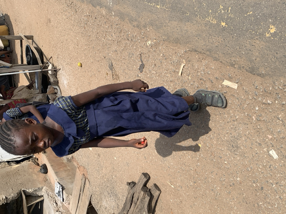 The scene depicts a young girl walking on a sunlit dirt and gravel path in Adankolo, Nigeria
