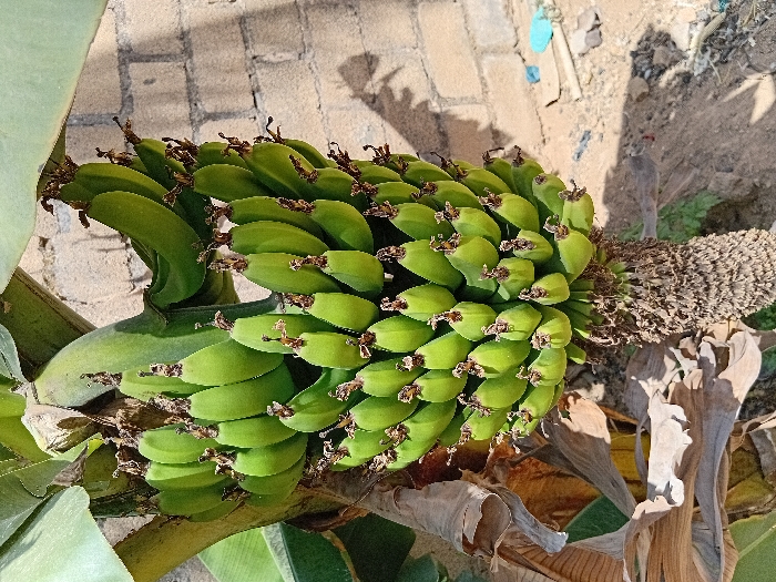 A vertical close-up shot captured in Bukuru, Nigeria, displays a substantial cluster of green, unripe bananas hanging from a banana plant. The bananas are numerous, forming multiple hands within a dense bunch, each exhibiting a small, dried, dark brown remnant at its tip. Portions of large green banana leaves are visible at the top and left, while dried, light brown banana leaves lie near the base of the plant on the lower left. The central peduncle from which the bananas emerge is thick and fibrous, tapering downwards. In the background to the right, a light-colored concrete block wall is partially visible, overlaid with distinct shadows. The ground beneath the plant consists of dry, light brown soil, with a light blue plastic bag and other minor debris present on the surface in the lower right quadrant. The scene is illuminated by strong daylight, casting defined shadows.