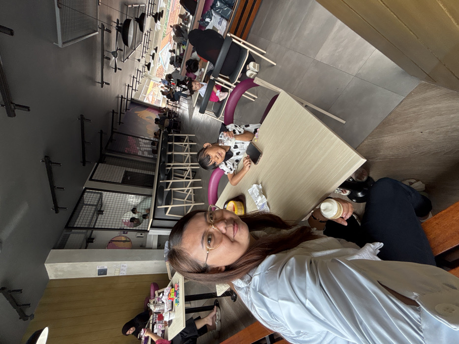 A woman and a child sit at a table in a busy restaurant. The woman is in the foreground, wearing glasses and a light-colored shirt. She holds a small jar in her hand. A young girl in a black and white dress sits across from her at the table, holding a phone. The restaurant is crowded, with other people dining in the background. The scene is well-lit and appears to be taken indoors.