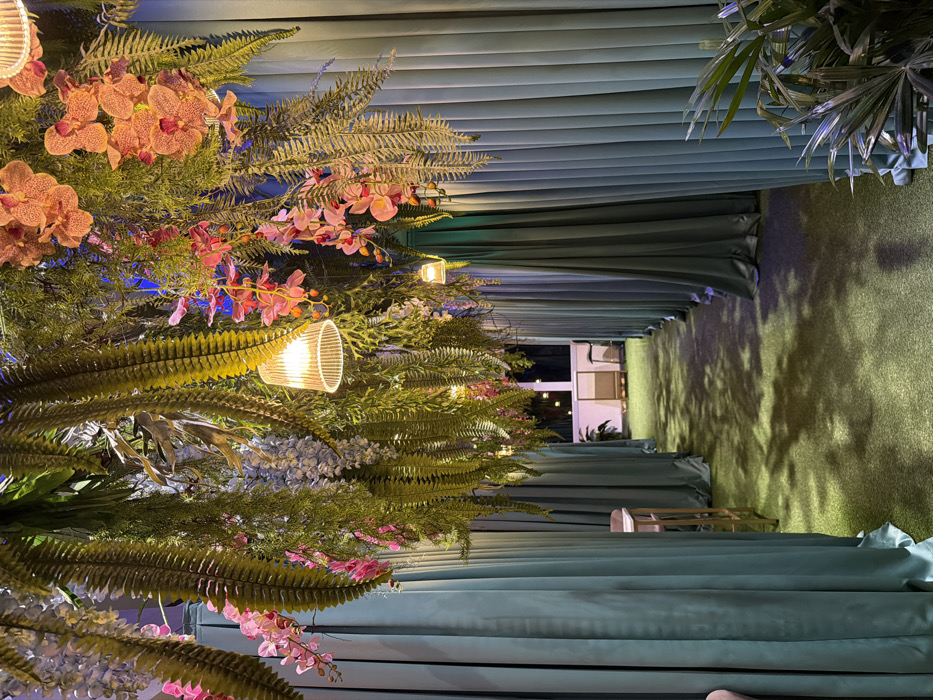This scene depicts an interior corridor within KABUGA (咖部嘎餐酒館) in Taipei, Taiwan. The narrow passageway features a densely decorated ceiling covered with artificial foliage, including various shades of green ferns, clusters of pink and orange orchids, and light blue wisteria-like blossoms. Multiple small, ribbed, translucent pendant lights are interspersed among the foliage, emitting warm yellow light that casts dappled shadows onto the green turf-like carpet covering the floor. The walls on both sides are lined with floor-to-ceiling pleated teal-colored fabric curtains. At the far end of the corridor, a brighter area reveals a white-framed window, a dark rectangular display stand, and a potted plant. A light-colored table is partially visible on the left side of the foreground, and broad-leafed green foliage is seen on the extreme right foreground. No individuals are present.