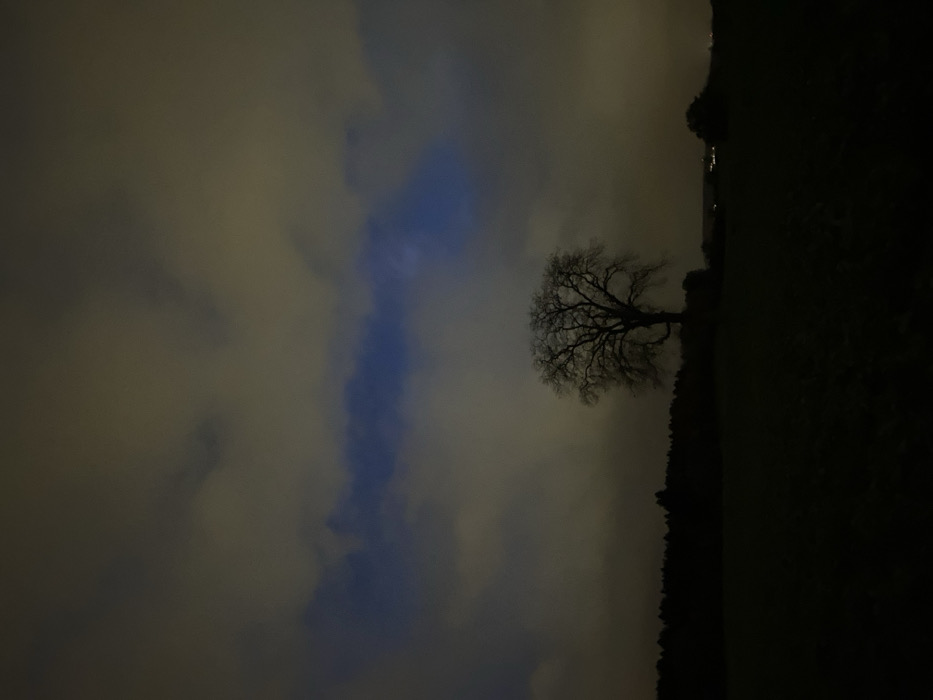The image captures an outdoor, nighttime scene in Glattbrugg, Switzerland. A prominent, leafless deciduous tree stands centrally in the mid-ground, its bare branches silhouetted against a cloudy sky. The sky is predominantly covered by extensive yellowish-grey clouds, with a horizontal band of dark blue sky visible through a break in the upper-middle portion. The foreground consists of a dark, open field with minimal discernible detail. A dense, dark treeline forms the horizon on the left side of the frame. In the distant background on the right, a cluster of small, bright artificial lights, indicative of an urban or suburban area, is visible. No individuals or animals are present.