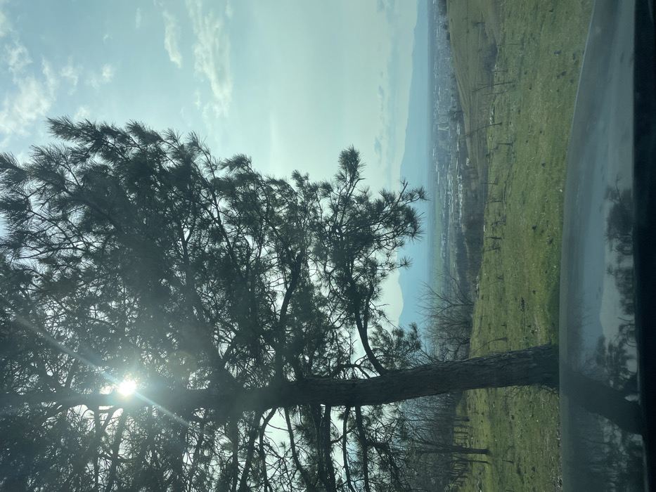 The image displays a panoramic view of the city of Karlovo, Bulgaria, from an elevated perspective, likely a hillside. A prominent evergreen tree, possibly a pine, stands in the left foreground, its trunk and dense foliage silhouetted against the bright sky. The sun is visible through the upper left branches of this tree, emitting a strong lens flare. Below the tree, the foreground shows a verdant, grassy slope with scattered, bare deciduous trees and shrubs, indicating an early spring season. The lower portion of the image reveals the reflective surface of a dark vehicle's hood, mirroring the sky and parts of the tree. Beyond the immediate hillside, the urban sprawl of Karlovo is visible in the midground, characterized by a concentration of buildings and infrastructure within a valley. Distant mountains, appearing hazy and blue-grey, form the backdrop on the horizon. The sky is partly cloudy, featuring patches of light blue interspersed with white cumulus clouds.