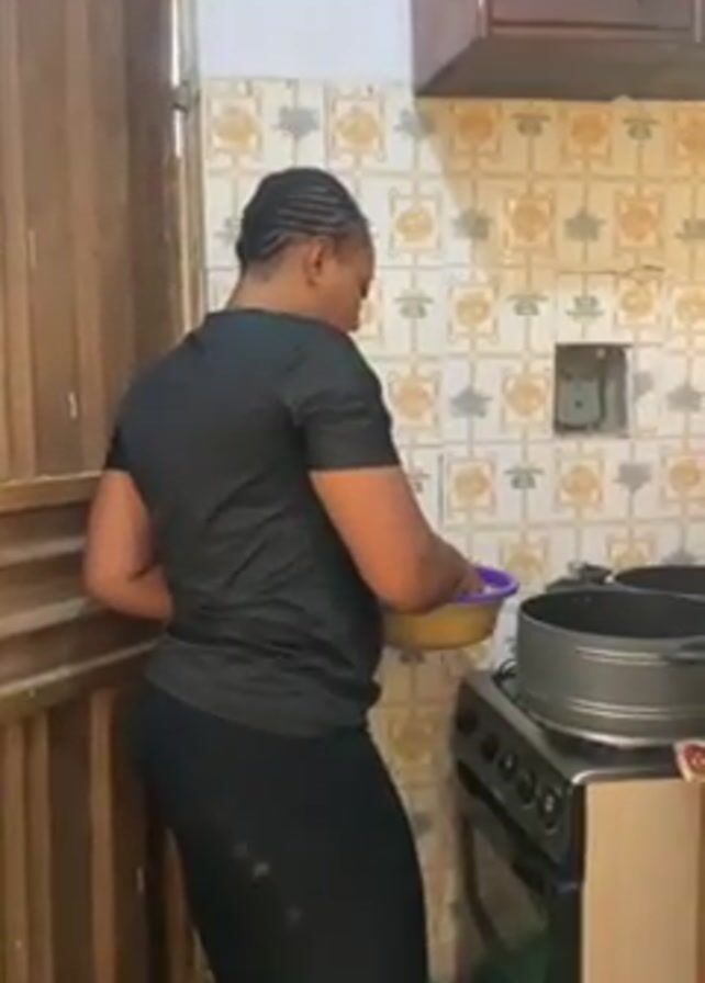 In a small kitchen with old, patterned tile, a Black woman wearing a black t-shirt and black leggings is seen from the waist up and from the back. She is putting food from a purple bowl into a large, gray pot on a gas stove. Another large pot sits next to it, and there is a kitchen cabinet mounted above the stove. To the woman’s left is a wooden door. The kitchen is small and contains basic appliances.