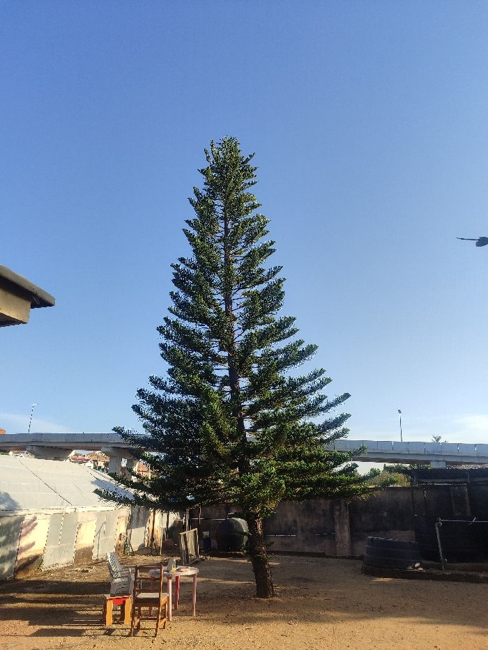This image depicts an outdoor area in the city of Jos, Nigeria, under a clear blue sky. A tall, slender evergreen tree, possibly a conifer, dominates the center of the frame, extending from the bottom edge to the upper third. The ground consists of dry, reddish-brown earth. To the left of the tree, in the midground, a partial view of a light-colored building's roof overhang is visible in the top left corner. Below this, an arrangement of outdoor furniture is present: a grey plastic chair, two wooden chairs, and two small tables (one light-colored with a red object, another possibly pink). Further back on the left, a large structure covered with translucent sheeting, possibly a greenhouse or storage facility, is visible. To the right of the tree, a dark, weathered wall runs horizontally. Adjacent to this wall, a black plastic water tank is visible, and further right, a stack of black tires. In the background, an elevated concrete overpass or bridge spans horizontally across the scene. Underneath and behind the overpass, various buildings and sparse vegetation are discernible. A street light pole with a luminaire extends above the overpass on the right, and another pole is visible to the left of the overpass. No individuals, actions, or direct interactions are visible within the scene. The lighting suggests daylight conditions, casting shadows from the left.