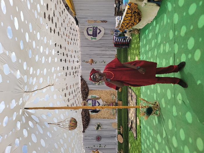 This image depicts an outdoor or semi-outdoor event setup in Jos, Nigeria. A dark-skinned male individual stands centrally, facing the viewer, holding a black microphone to his mouth, indicative of speaking or performing. He wears a traditional Nigerian outfit in deep red, comprising a loose-fitting tunic and trousers, a matching red headwrap, dark sunglasses, an orange beaded necklace, and dark shoes. Above him, a white fabric canopy, perforated with numerous irregular oval-shaped cutouts, allows daylight to filter through, casting distinct circular light patterns onto the green artificial turf or carpet that covers the ground. This canopy is supported by a prominent central pole, wrapped in yellow fabric, near which a woven basket holding decorative brushes is positioned on the ground. The background consists of a wall draped in white fabric, adorned with various decorative elements. These include two green and white circular logos or emblems (partially visible, possibly reading "SELIDOL"), several woven circular mats, hanging gourds, and white floral arrangements. To the right, a table draped in white cloth, with a yellow and black patterned fabric overlay, displays serving dishes. A small blue and white striped stool is visible behind this table. To the left, a hanging woven basket is present. Two dark, patterned rugs lie on the green ground towards the left background. The overall scene suggests a cultural celebration or gathering during daytime hours.