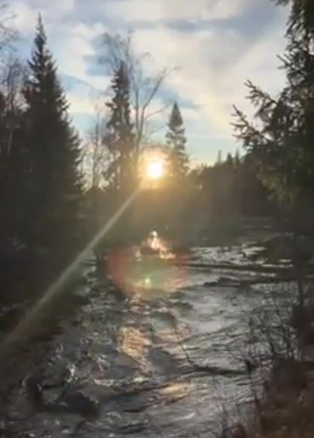 The video opens with a shot of a narrow river flowing between dense trees, sunlight glinting off the water