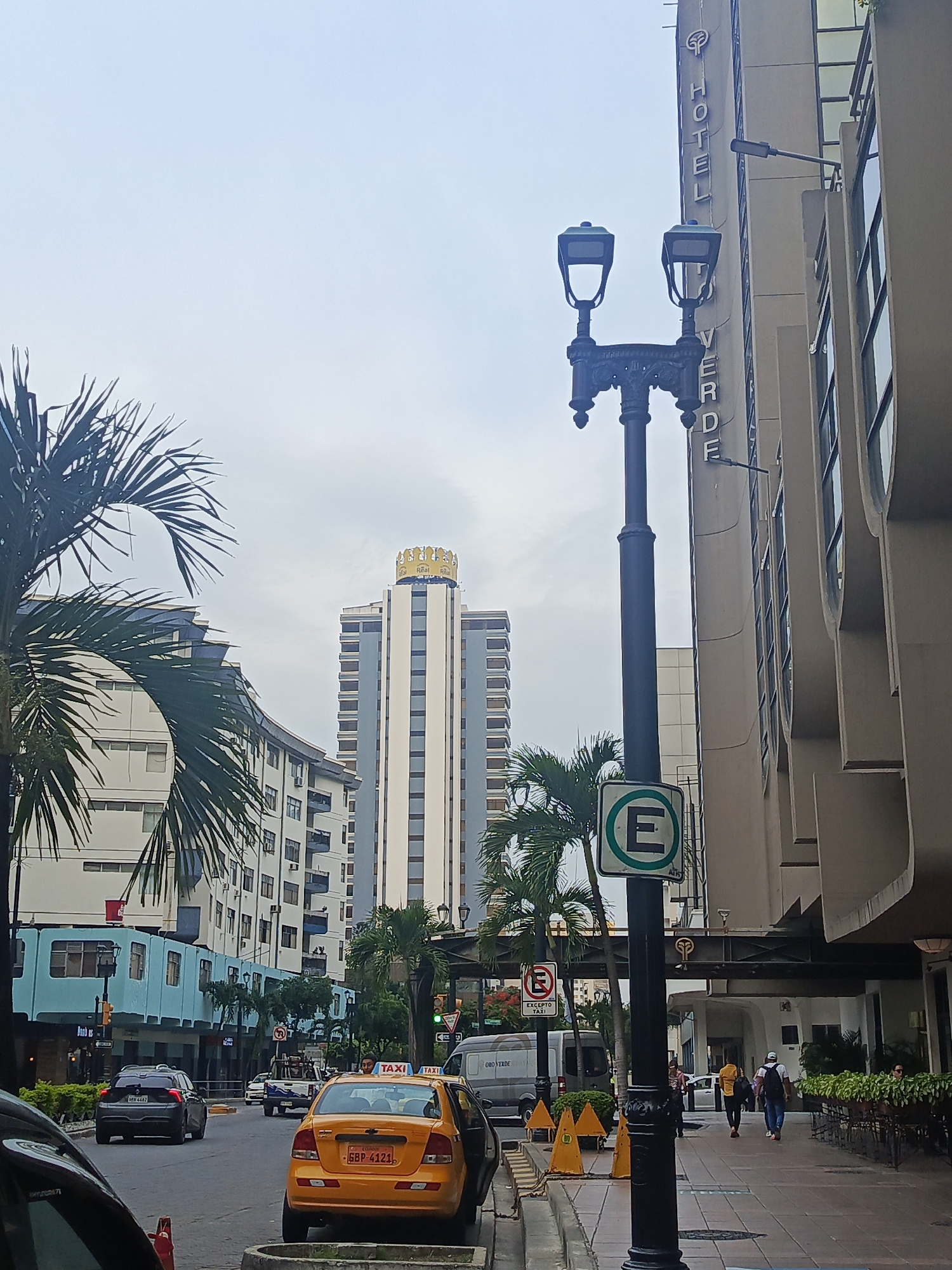 This is a street scene in Guayaquil, Ecuador, during daytime under an overcast sky