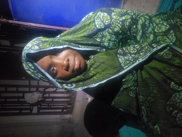 A woman is wrapped in a green patterned fabric, possibly a "Mama Wax" print. The fabric covers her head, and its edge reveals visible text. Her face is well-lit, highlighting her features including a nose ring. A blue object is in the background, along with dimly lit surroundings that suggest indoor or nighttime conditions. There's a structure with horizontal bars behind her.