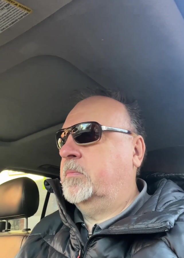 middle-aged man sitting in the driver's seat of a car. He is wearing sunglasses and a black puffy jacket. He has a goatee and his hair is thinning. The car interior is visible, including the headrest, ceiling, and sun visor. Music is playing in the background. The man is looking straight ahead.