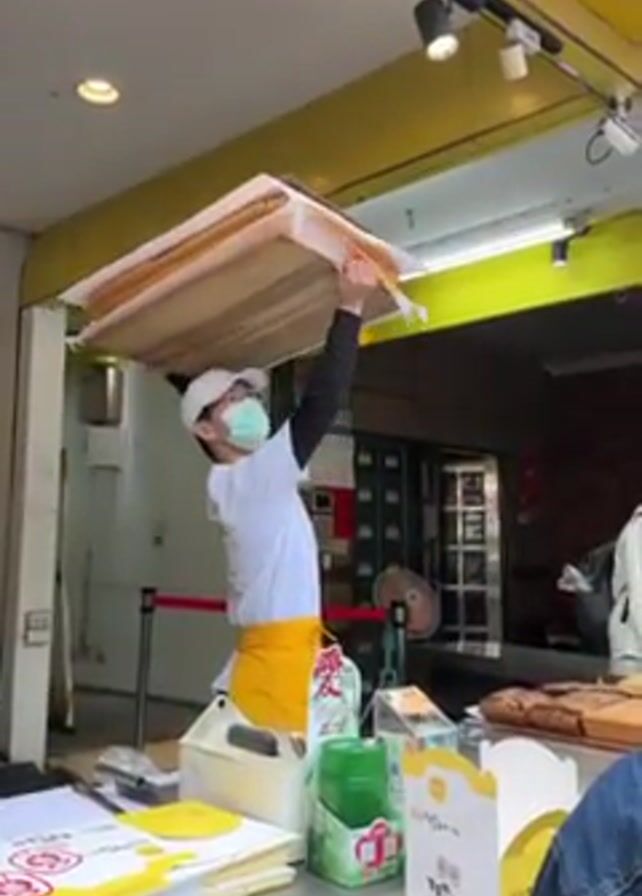 A worker in a bakery is shown carrying a stack of rectangular trays covered with white paper above their head. The worker is wearing a white t-shirt, yellow apron, white cap, black arm coverings, and a blue surgical mask. The bakery has a yellow awning and indoor lighting. The person carries the stack of trays behind the counter. A stack of papers and boxes sits on the counter in front of the viewer. A fan is seen in the background.