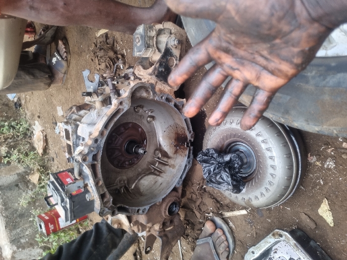 An automatic transmission is disassembled, revealing its internal components, including the torque converter partially covered with a black plastic bag. Parts are laid out on the ground, alongside tools such as a portable battery charger. A mechanic with hands soiled with grease is likely working on the repair. The work area appears to be outdoors or in a partially open space.