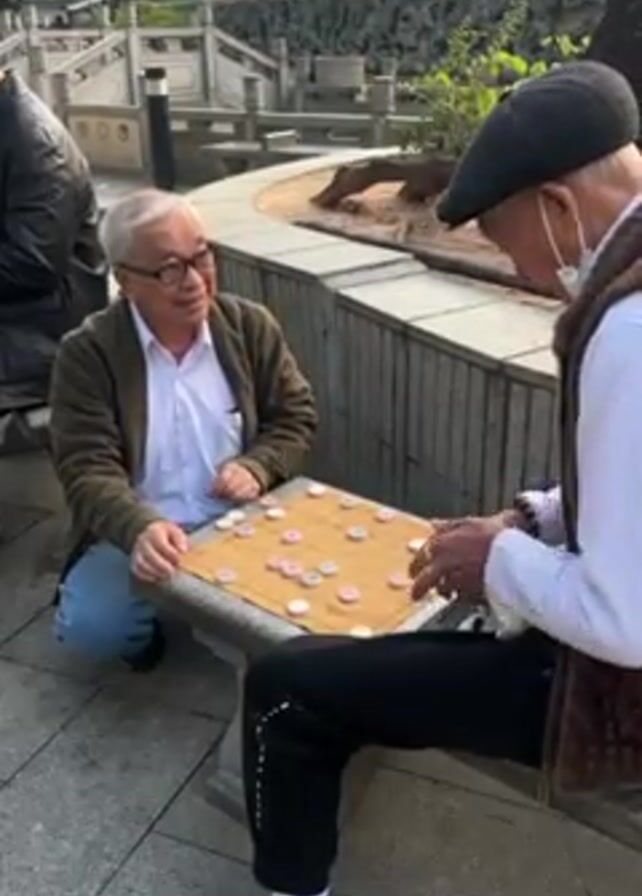 two elderly men playing a board game in a park. The man on the left is kneeling next to the stone bench, wearing a green jacket, white shirt, and blue jeans, with glasses on his face. The man on the right is sitting on the bench, wearing a cap, brown vest, and white shirt, and a face mask. They are both looking at the board, which has circular pieces on it. The man on the left is pointing at the board and talking. In the background, there are trees, stone stairs, and other people. The setting appears to be a traditional Chinese garden.