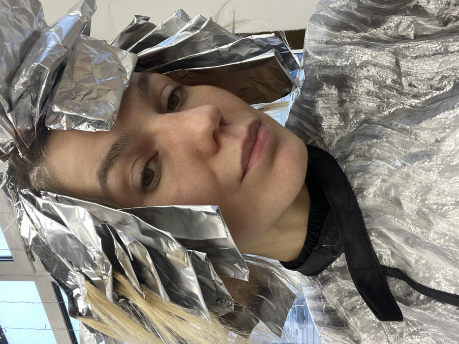 This image, situated in a hair salon in Moscow, Russia, depicts an adult female undergoing a hair treatment. Her blonde hair is meticulously sectioned and wrapped in numerous rectangular aluminum foil packets, indicating a highlighting or coloring process. She looks directly at the viewer with a neutral expression. Her complexion is fair, exhibiting light freckles on her nose and cheeks, and her eyes are light brown. She is clad in a translucent, textured silver-colored salon cape, fastened around her neck by a black collar with a visible Velcro closure. The background includes a window on the left, showcasing a blurred, overcast urban exterior with subtle reflections of string lights. No specific landmarks or unique architectural elements are present to identify a precise location within Moscow, Russia; the depicted environment is a generic salon interior.
