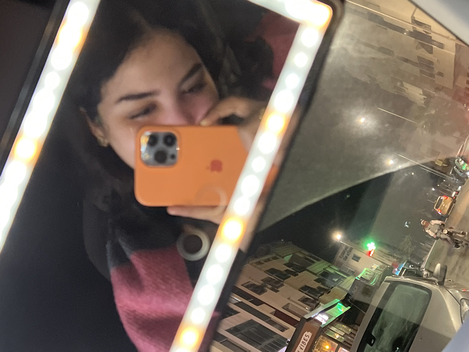 A woman is taking a selfie in a mirror. She holds an orange iPhone, partially obscuring her face. The mirror has a border of bright white lights, and the reflection includes a view of a street at night. Buildings are visible, along with street lights and vehicles. A sign reading "GOOD VIBES" is partially visible. The overall image is tilted, creating a dynamic perspective.