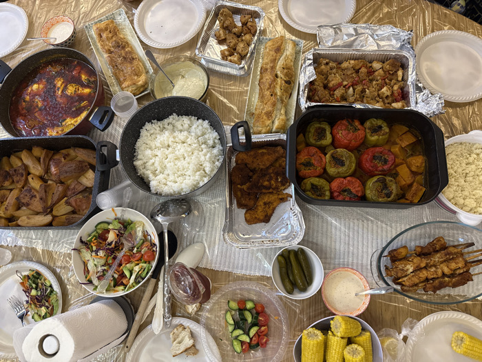 An overhead view captures a dining table in Holon, Israel, covered with a reflective, light-colored plastic tablecloth. No individuals are present. The table is laden with numerous dishes, suggesting a communal meal. Key elements include: - A black rectangular baking dish in the center-left holding baked stuffed bell peppers (red and green) with roasted root vegetables. - A clear glass dish above it contains multiple chicken skewers. - To the far left, a white bowl holds a grain dish, likely couscous or bulgur. - At the top, a white bowl presents four boiled corn cobs, and a glass bowl contains a mixed salad of tomatoes, cucumbers, and red cabbage. A white paper towel roll on a stand is visible in the upper-right quadrant. - On the right side, a black rectangular pan contains roasted potato wedges. - A black round pot at the bottom-right holds a stew-like dish, potentially fish or chicken in a tomato-based sauce. - A black round pot in the center-right contains white rice. - Below the rice, a small aluminum tray holds fried chicken pieces or schnitzel. - An aluminum foil tray below the stuffed peppers contains diced chicken and sautéed vegetables. - A clear glass rectangular dish near the bottom-center showcases a golden-brown baked pastry, possibly borekas. - Supplementary items include a clear glass bowl of gherkin pickles, small white bowls containing white and light-colored sauces, several white disposable plates, clear plastic cups, and various serving utensils such as forks, spoons, a large ladle, and tongs.