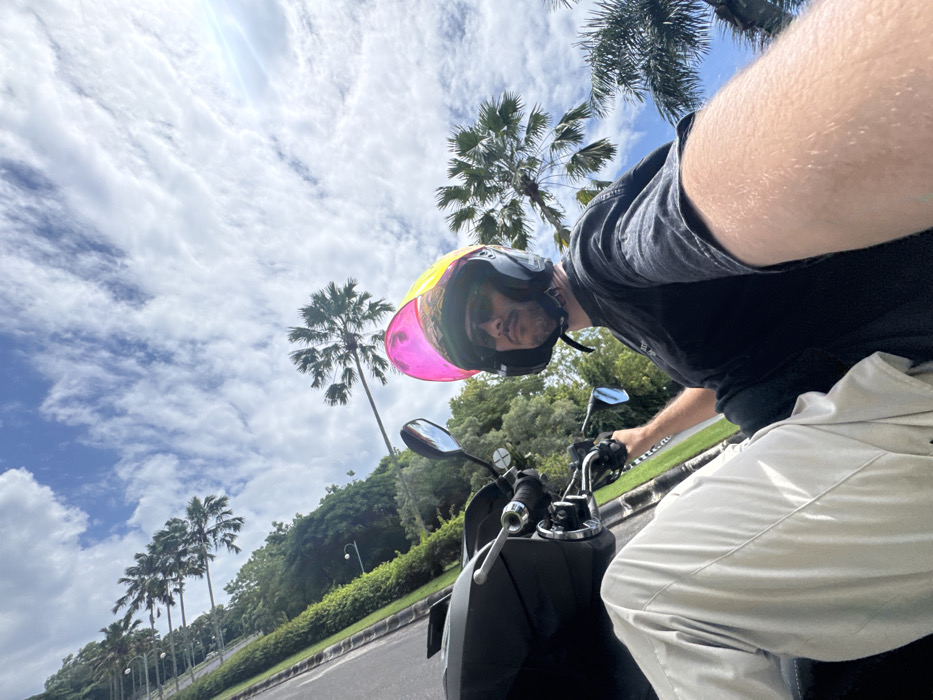 - "A man wearing a helmet with a bright visor rides a scooter on a paved road lined with palm trees and greenery" by FM-3l5D82, licensed under CC BY 4.0