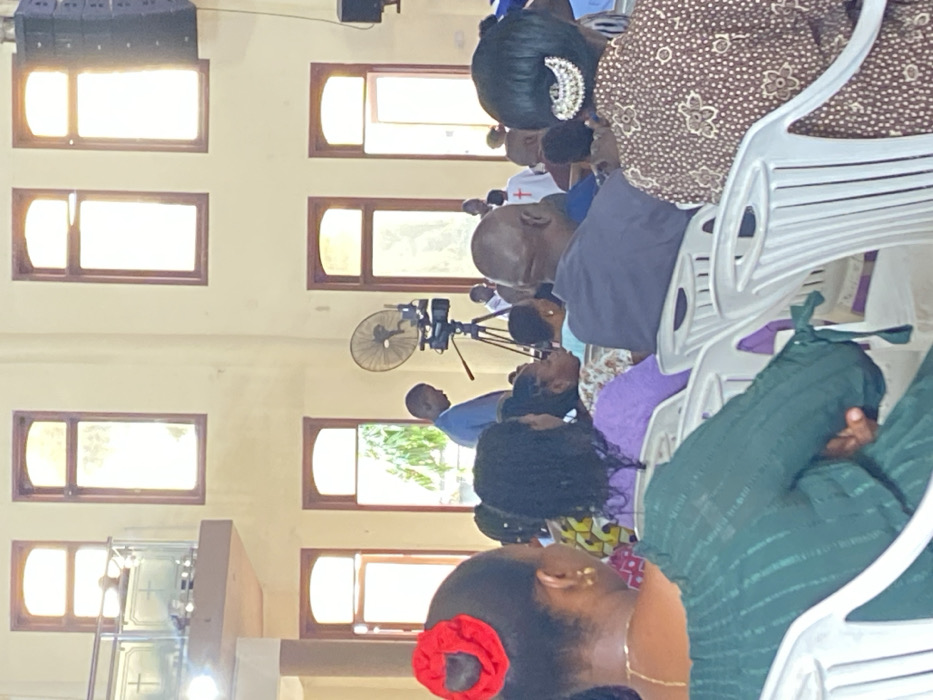 n interior scene from what appears to be a church or a religious ceremony. The scene is located at the coordinates -6.889, 39.286 in Dar es Salaam, Tanzania. The space is characterized by high ceilings, wooden trim on windows, and white walls. The windows are large and many, allowing natural light to flood the room. Several rows of white plastic chairs face the front of the room where a man in a blue shirt is standing. A camera on a tripod and a fan are behind him. A man dressed in a white robe with a cross on his chest is seated at a table near the camera. Several other people are seated in the rows of chairs, facing the front. One woman in a green dress is seated in the foreground with a red headband and a small, silver necklace. Her arms are crossed in front of her. Another woman in a patterned brown and white dress is seated to her right. The scene appears to be a gathering for a religious service. The attendees are focused towards the front of the room where the man in the blue shirt is standing. There is a sense of quiet expectation in the air.
