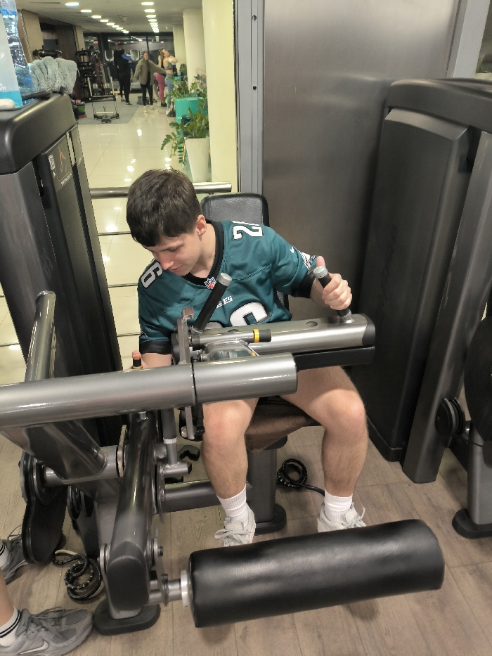 - "A young male, wearing a teal American football jersey with a white number '2' visible and an 'NFL' logo, brown shorts, white socks, and white athletic shoes, is seated on a leg exercise machine in a fitness center located in Varna, Bulgaria" by FM-QsyOh2, licensed under CC BY 4.0
