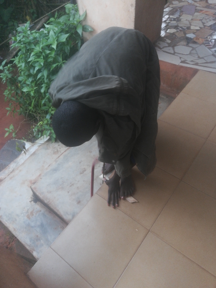 A dark-skinned individual, wearing a dark olive-green long-sleeved garment and dark trousers, is depicted bending sharply forward and downward, with their head lowered. Their hands are placed flat on a light-brown tiled surface, and they are barefoot. A small, light-colored object, possibly paper, lies on the tiles near their left foot. Behind the individual, a lower, uneven concrete or stone surface with reddish-brown discolorations is visible, alongside a cluster of green leafy vegetation. In the upper right background, a mosaic-tiled surface composed of irregular white, grey, and brown fragments is present, adjacent to a light-colored vertical structural element. A slender, reddish-brown vertical object is partially visible behind the individual's lower legs. The scene is reportedly located in Alor, Nigeria.
